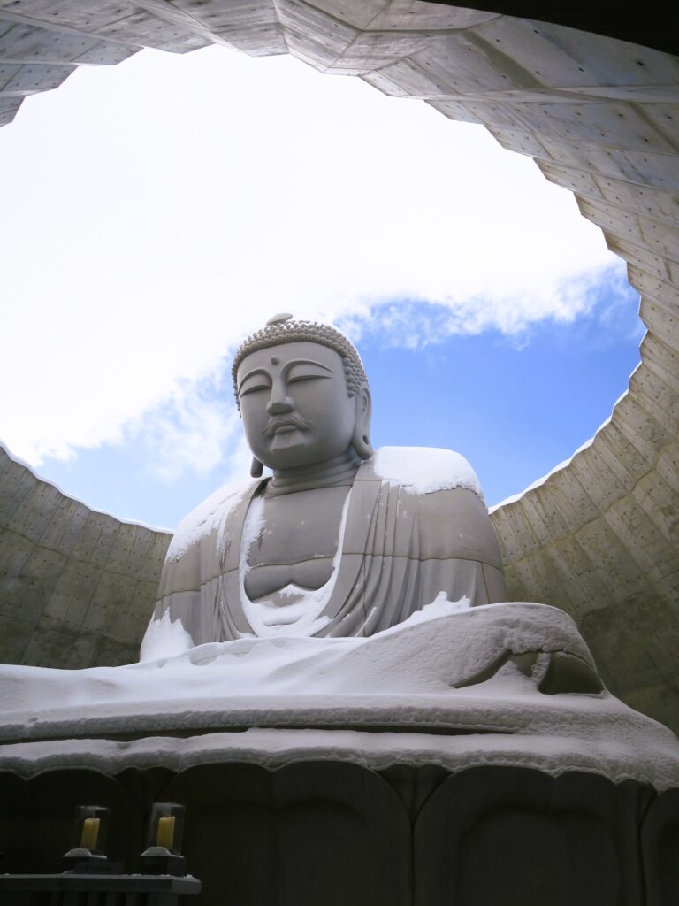 le grand Bouddha de Sapporo (architecture Tadao Andô) médite, imperturbable, sous les éléments …