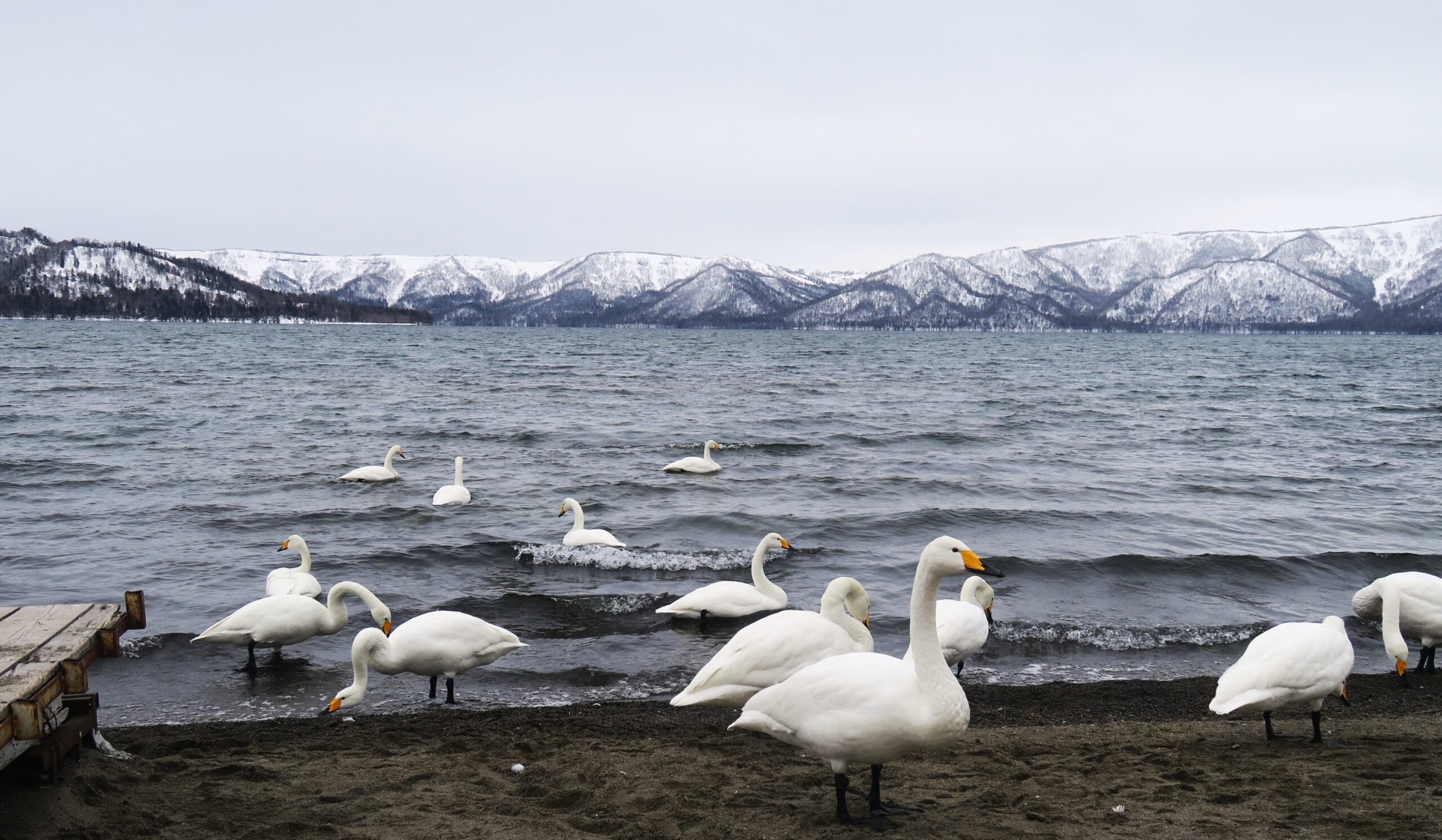au bord du lac Kussharo (Hokkaido), rendez-vous annuel de la migration des cygnes chanteurs, de petites sources chaudes donnent un peu de répit aux mains engourdies malgré les gants